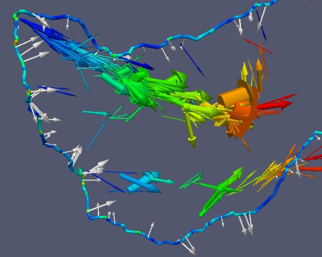 The wiggly tube shows the shape of a cosmic string taken from a simulation, at a particular moment in time. This string is about to emit several bursts of loops. The color of the string shows its rate of motion, red being very close to the speed of light and blue being slowest, and the white arrows show the direction and velocity of selected string segments.